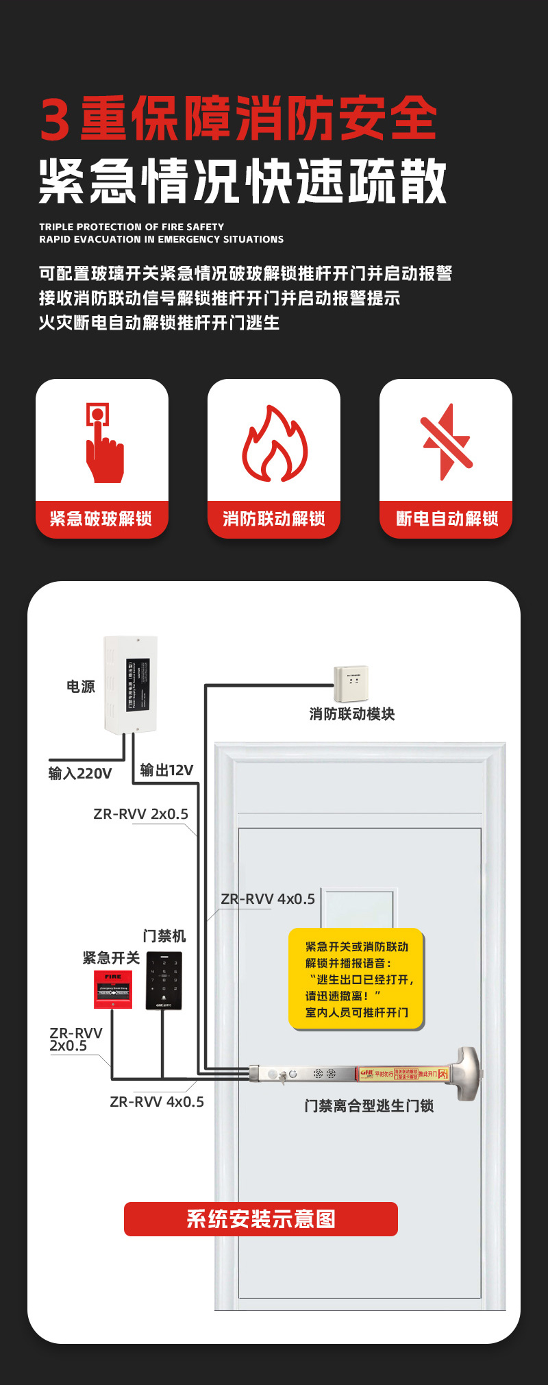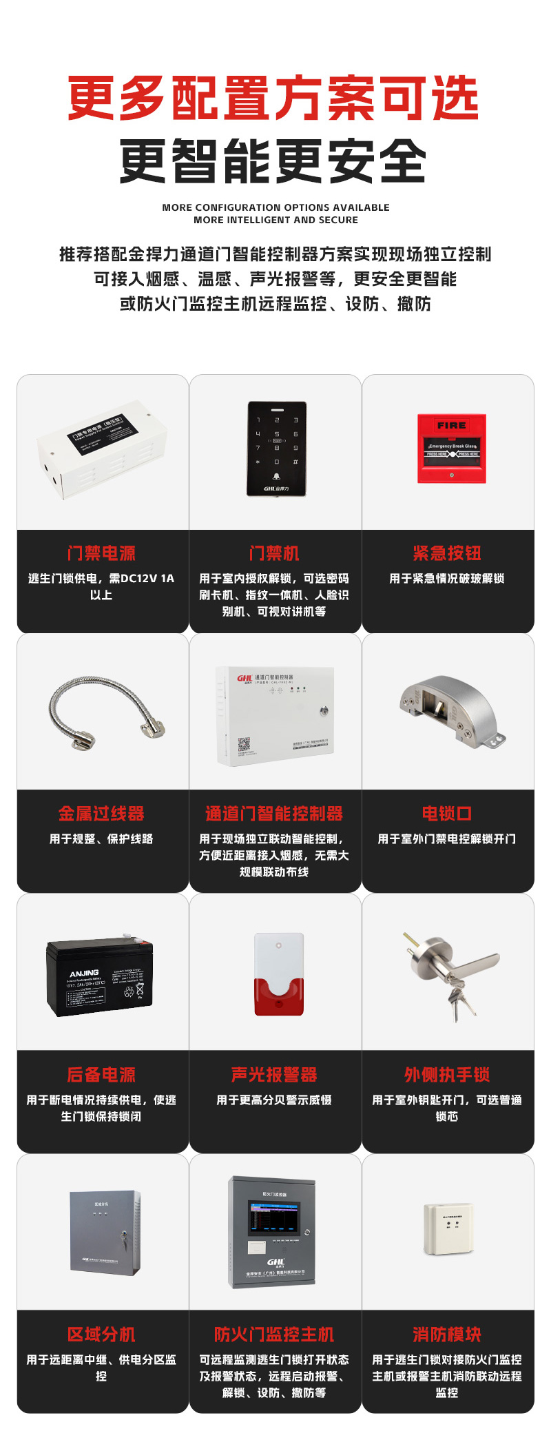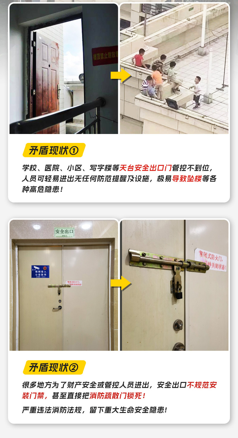 用途:商場(chǎng)、超市安全門(mén),醫(yī)院、小區(qū)天臺(tái)門(mén)等“安消一體”門(mén)禁管控