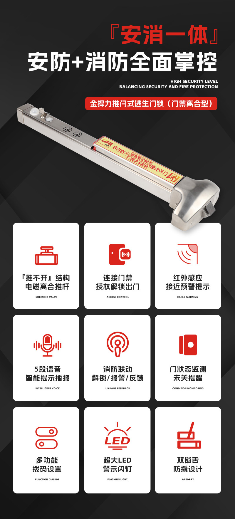 門(mén)禁離合型逃生門(mén)鎖 紅外感應(yīng)語(yǔ)音報(bào)警推桿鎖 消防聯(lián)動(dòng) 門(mén)未關(guān)提醒 金捍力-逃生門(mén)鎖系列-金捍安全官網(wǎng)-逃生門(mén)鎖-推桿鎖-自動(dòng)平開(kāi)門(mén)機(jī)-電動(dòng)閉門(mén)器-電磁門(mén)吸-防火門(mén)控制器-“安消一體”智能門(mén)控專業(yè)廠家