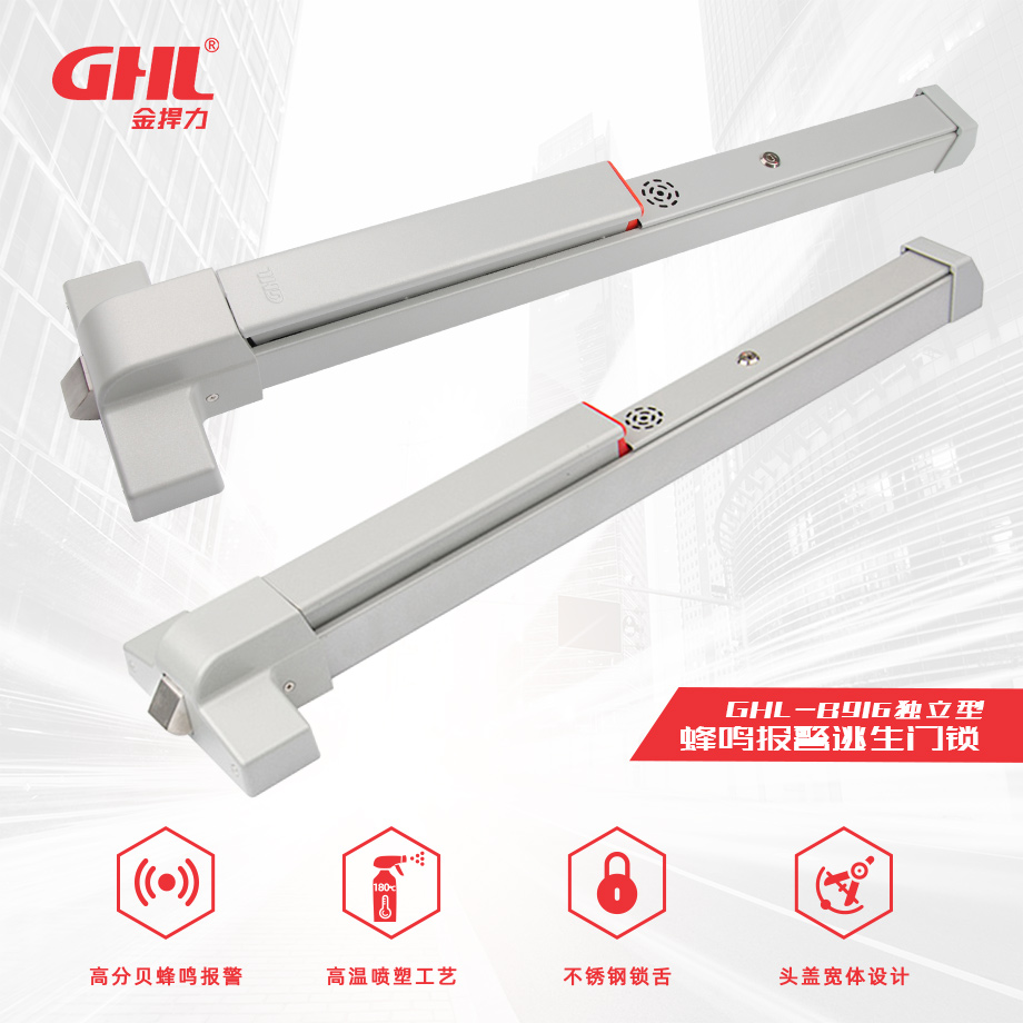獨(dú)立型蜂鳴報(bào)警逃生門鎖 GHL-B916 橫式鎖 噴塑 金捍力-蜂鳴報(bào)警逃生鎖-金捍安全官網(wǎng)-逃生門鎖-推桿鎖-自動(dòng)平開門機(jī)-電動(dòng)閉門器-電磁門吸-防火門控制器-“安消一體”智能門控專業(yè)廠家