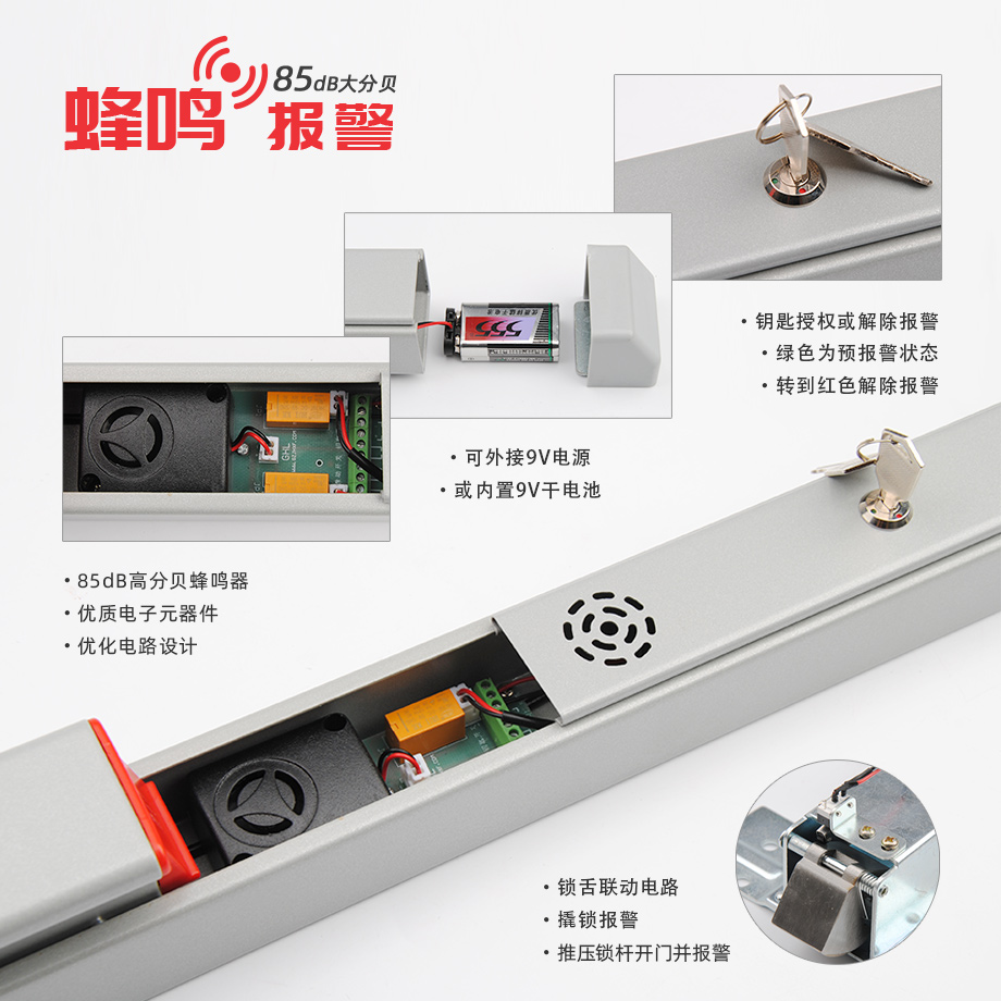 金捍力GHL-B916獨(dú)立型蜂鳴報(bào)警逃生門鎖采用85dB高分貝蜂鳴器和優(yōu)質(zhì)電子元器件,經(jīng)過優(yōu)化的電路設(shè)計(jì),故障率低、安全可靠??赏饨?V電源或內(nèi)置9V干電池。