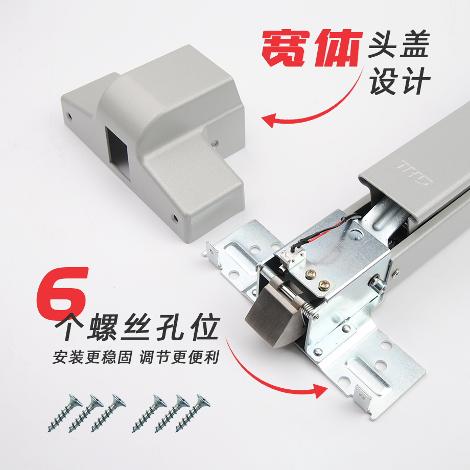 金捍力逃生門鎖系列皆采用大頭蓋寬體設(shè)計(jì),鎖頭面積更大更圓潤(rùn),固定面板設(shè)計(jì)6個(gè)螺絲孔位,比一般的逃生門鎖4孔位,安裝更穩(wěn)固,微調(diào)安裝位置也更便利。