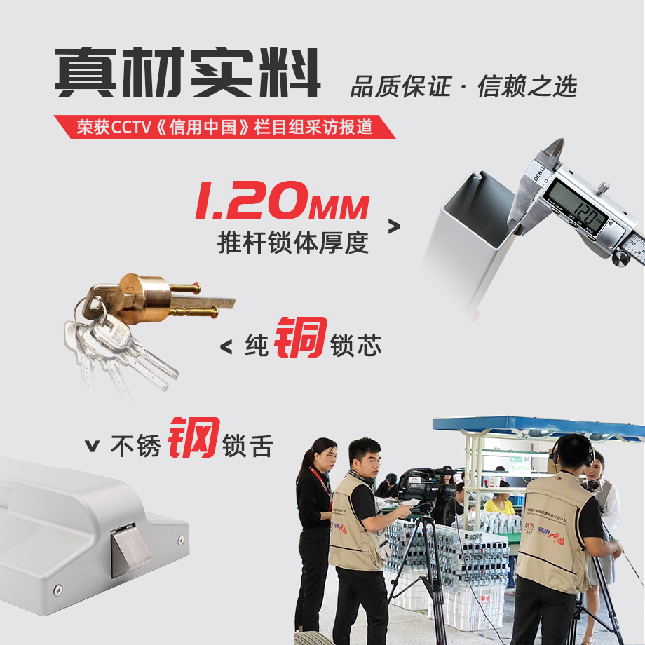 金捍力逃生門鎖真材實(shí)料,品質(zhì)有保障,故而獲得CCTV《信用中國》欄目組的采訪報(bào)道。金捍力逃生門鎖噴塑鎖體厚度達(dá)1.20mm以上,比一般逃生門鎖都要厚實(shí),耐用。鎖芯采用純銅材料,鎖舌精選不銹鋼材質(zhì)鑄造。