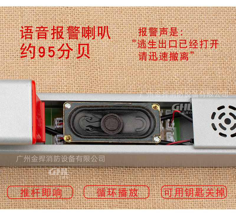 3、推壓鎖杠啟動(dòng)警笛語音“逃生出口已經(jīng)打開,請(qǐng)迅速撒離+WO. WO. WO"報(bào)警語音, 井循環(huán)播放;