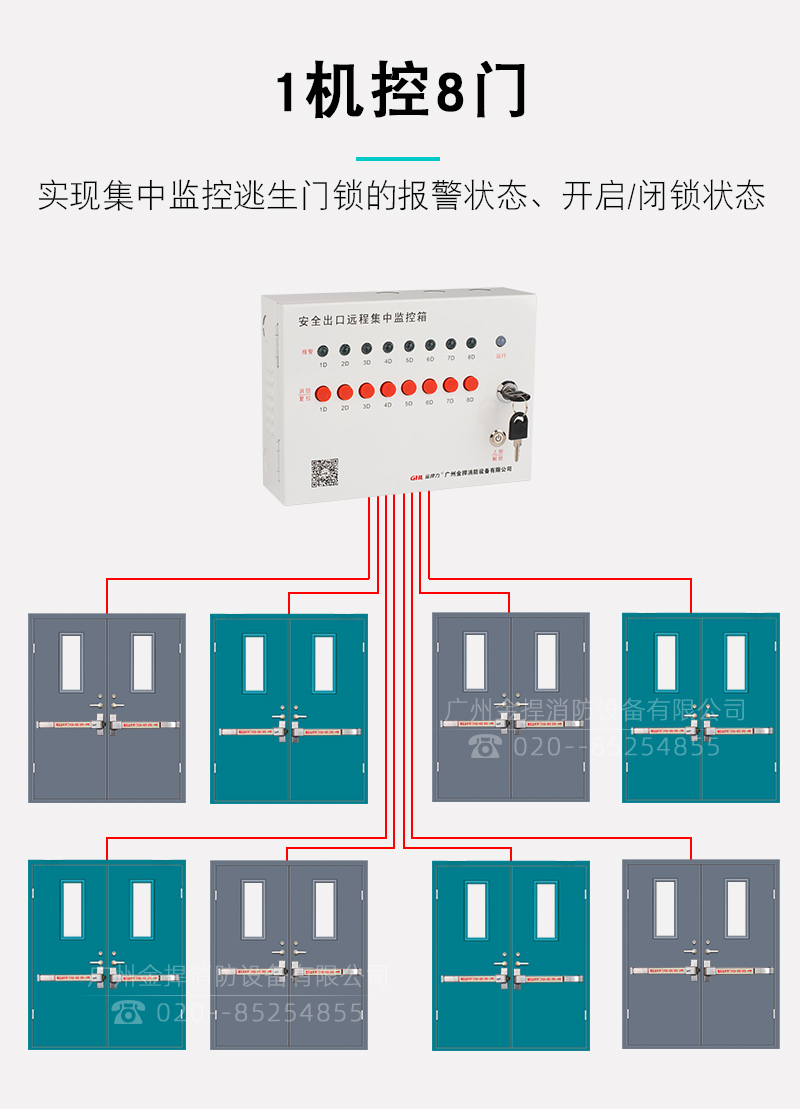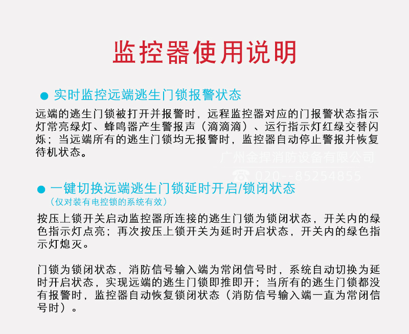 產(chǎn)品介紹:1、實(shí)時(shí)監(jiān)控遠(yuǎn)端逃生門鎖報(bào)警狀態(tài); 2、遠(yuǎn)端的逃生門鎖被打開并報(bào)警時(shí),遠(yuǎn)程監(jiān)控器對應(yīng)的門報(bào)警狀態(tài)指示燈常亮綠燈、蜂鳴器產(chǎn)生警報(bào)聲(滴滴滴)、 運(yùn)行指示燈紅綠交替閃爍,當(dāng)遠(yuǎn)端所有的逃生門鎖均無報(bào)警時(shí),監(jiān)控器自動(dòng)停止警報(bào)并恢復(fù)待機(jī)狀態(tài)。 一鍵切換遠(yuǎn)端逃生門鎖延時(shí)開啟/鎖閉狀態(tài)(僅對裝有電控鎖的系統(tǒng)有效): 3、按壓上鎖開關(guān)啟動(dòng)遠(yuǎn)程監(jiān)控器所連接的逃生門鎖為鎖閉狀態(tài),開關(guān)內(nèi)的綠色指示燈點(diǎn)亮,再次按壓上鎖開關(guān)為延時(shí)開啟狀態(tài),開關(guān)內(nèi)的綠色指示燈熄滅。 4、門鎖為鎖閉狀態(tài),消防信號輸入端為常閉信號時(shí),系統(tǒng)自動(dòng)切