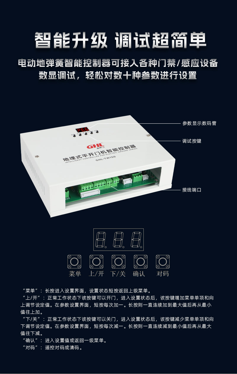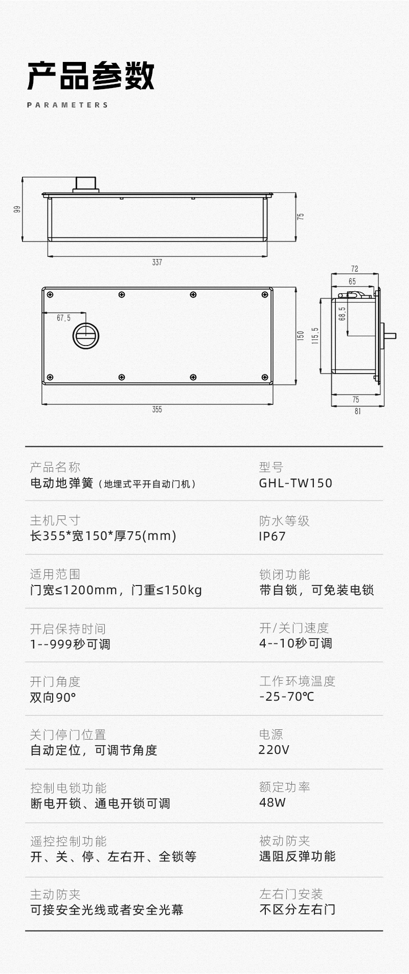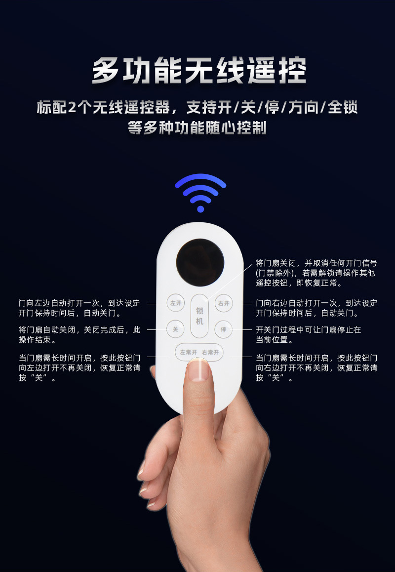 產(chǎn)品介紹:● 承重150KG,適用門寬≤ 1.2 米● 支持升級4G 遠程控制、開關狀態(tài)反饋● 雙向90 度開啟,帶自鎖功能,可免裝電鎖● 多功能遙控器,支持單獨控制左開、右開、鎖外功能