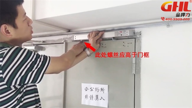 1、注意:連桿處螺絲注意不要頂?shù)介T扇,應(yīng)高于門框。