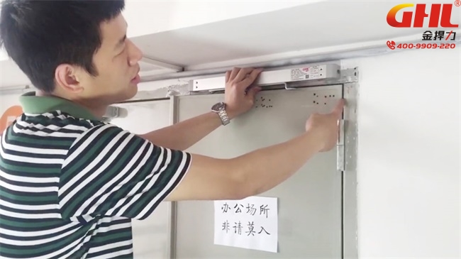 2、電動閉門器滑軌頂端對齊門扇合頁縫隙處,利于開門角度開到最大。